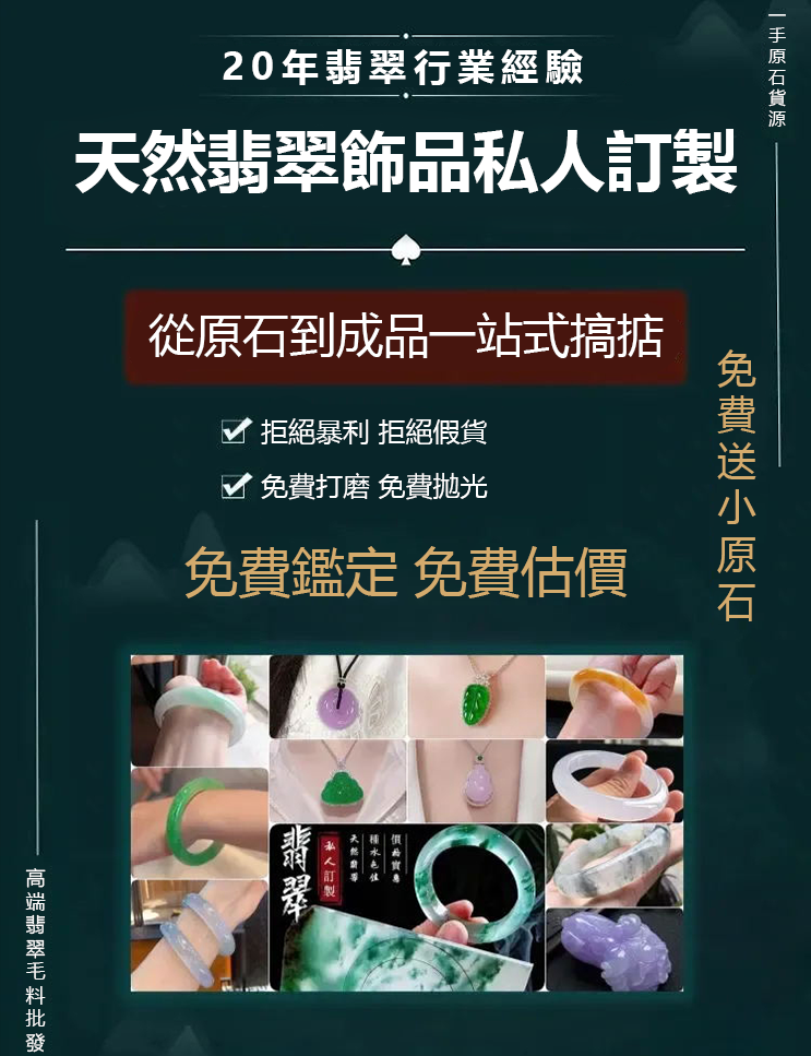 隨 著互聯網的高速發展,喜歡翡翠的翠友不能來到緬甸,只能透過圖片看翡翠,但是一些商家總是把顏色調的美美的發給客戶,而我們一直堅持在鏡頭下直播翡翠原 石,讓大家看到翡翠原石最真實的樣子,也為了讓各位翠友買到高品質且性價比高的天然翡翠部,我們公司成立了電商!全心全意為翠友們創造便捷條件!拒絕翡翠 中間商,直接從緬甸源頭採購,從翡翠原石到加工成成品,一條龍個性化服務!新增 (點擊復製),觀看Live直播拍賣。